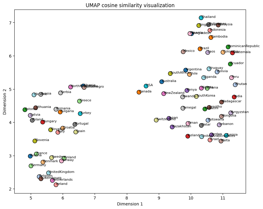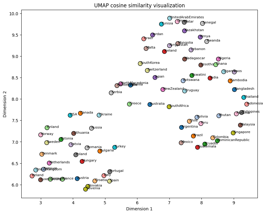 Finally, I wanted to identify which countries the model considered most similar. To achieve this, I created 2-dimensional t-SNE and UMAP embeddings using the rows of the confusion matrix. Based on a ChatGPT suggestion, I also generated an alternative version where I calculated the cosine similarity of the confusion matrix, resulting in a matrix containing information about the similarity between different countries. After dimensionality reduction on this matrix, UMAP turned out to give a more intuitive representation. As can be seen, most European countries are all clustered on the lower left side, with the Netherlands, Belgium and Denmark being especially close. The Nordic countries are also clustered together, as well as the Baltic countries. The Middle Eastern countries are all nicely clustered at the top, and tropical Asian countries on the right side. The ResNet-152 UMAP visualization below the ResNet-101 I find especially satisfying. On the left side Western European countries are clustered together, slowly moving more towards Eastern European countries when following the positive second dimension. On the other side you have Asian countries around the equator together, which apparently are similar to tropical Latin American countries such as the DR an Brazil.