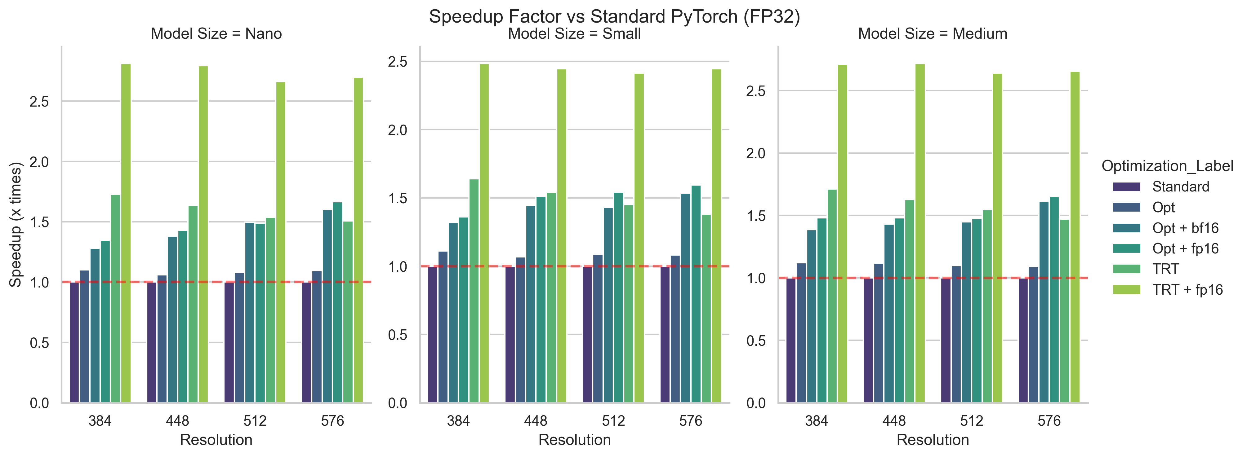 As can be seen in the figure below, the speedup gained from using TensorRT with FP16 is roughly the same across the board. Notably, TRT really starts to shine when you use FP16 precision.